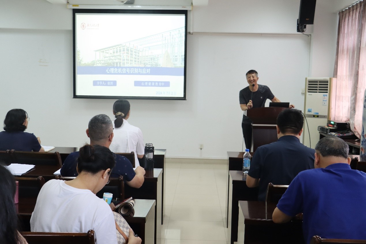 为加强学院教职员工身心健康,提高班主任老师的心理危机识别技能,7月2日,学院在B北217室举行了心理危机信号识别与应对技巧专题培训。邀请学校心理健康教育中心徐剑老师主讲。培训会由学院党委书记林伟英主持,全体教职员工参加。